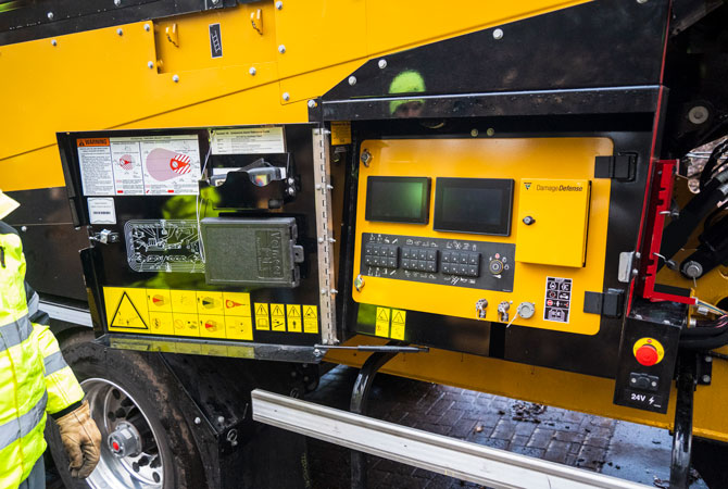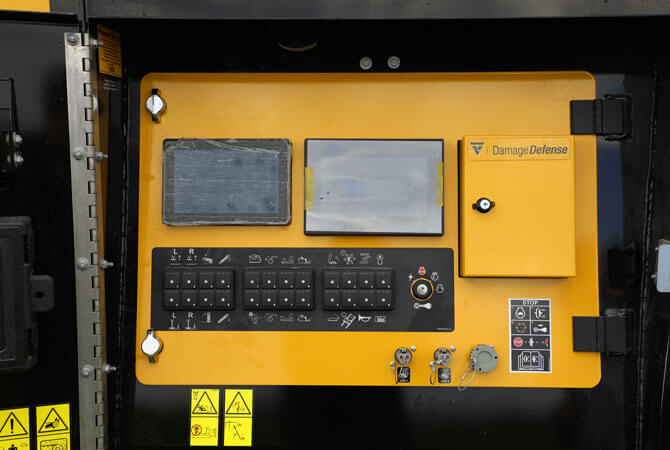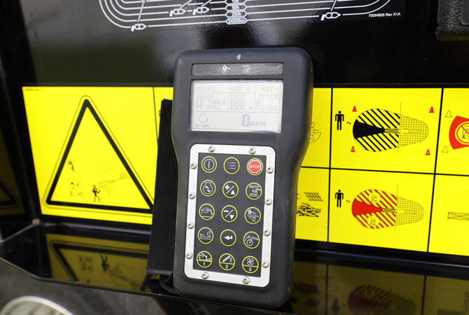 Une commande à distance sans fil permet à l’opérateur de piloter la plupart des fonctions de la machine jusqu’à une distance de 91 m. Depuis la cabine, l’opérateur peut ainsi, en fonction du type de matériaux, modifier les paramètres de la machine, notamment les réglages de l'alimentation et la hauteur du tapis.
