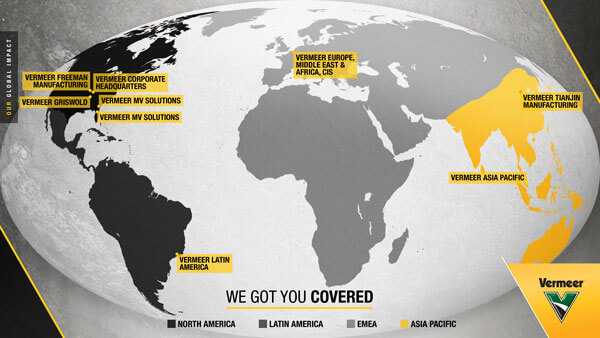 Los equipos Vermeer se venden en una robusta red de más de 600 distribuidores industriales y de forraje en todo el mundo. Ayudan a dar a nuestros clientes la confianza local que necesitan para hacer su importante trabajo.