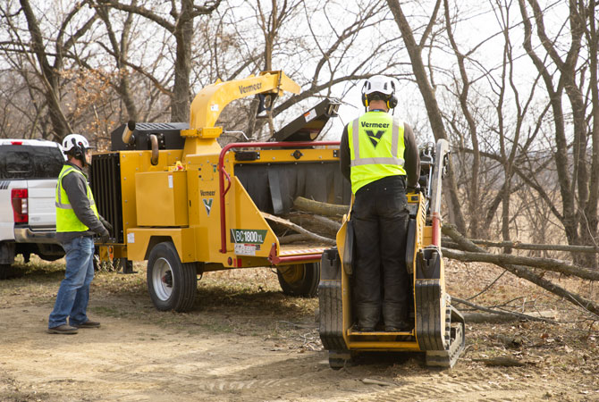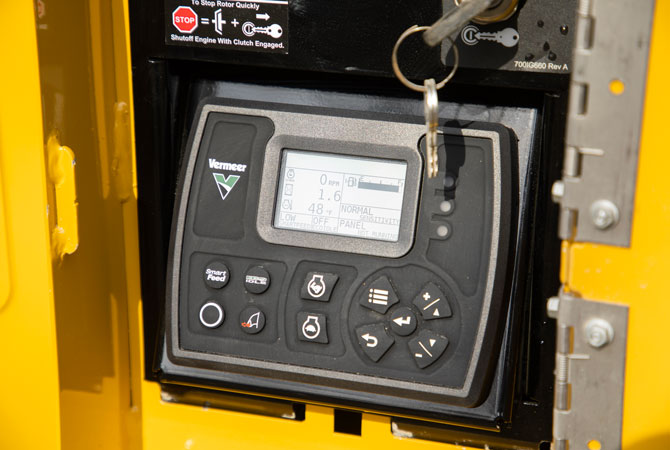 The optional Tree Commander™ remote control enhances jobsite productivity by enabling remote operation of brush chipper functions and can be conveniently attached to the operator’s belt or mounted on a Vermeer mini skid steer.
