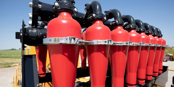 The three-tank (scalped, middle and clean) R600T reclaimer has a total fluid capacity of 7,729 gallons (29,257.4 L), and can process 1,100 gallons per minute (4,163.9 L/min) of drilling slurry for a true cleaning capacity suited for HDD projects in the 600-gallons-per-minute (2,271.2-L/min) range. The drilling slurry cycles through two 10-inch (25.4-cm) desanders and a desilter manifold with sixteen 5-inch (12.7-cm) desilters to remove sand and coarse material before being deposited onto the unit’s linear motion shaker decks. The unique design of the desilter manifold reduces turbulence when the liquid exits the hydrocyclone to help minimize recycled sand content and keep spoil/soil moisture levels low.